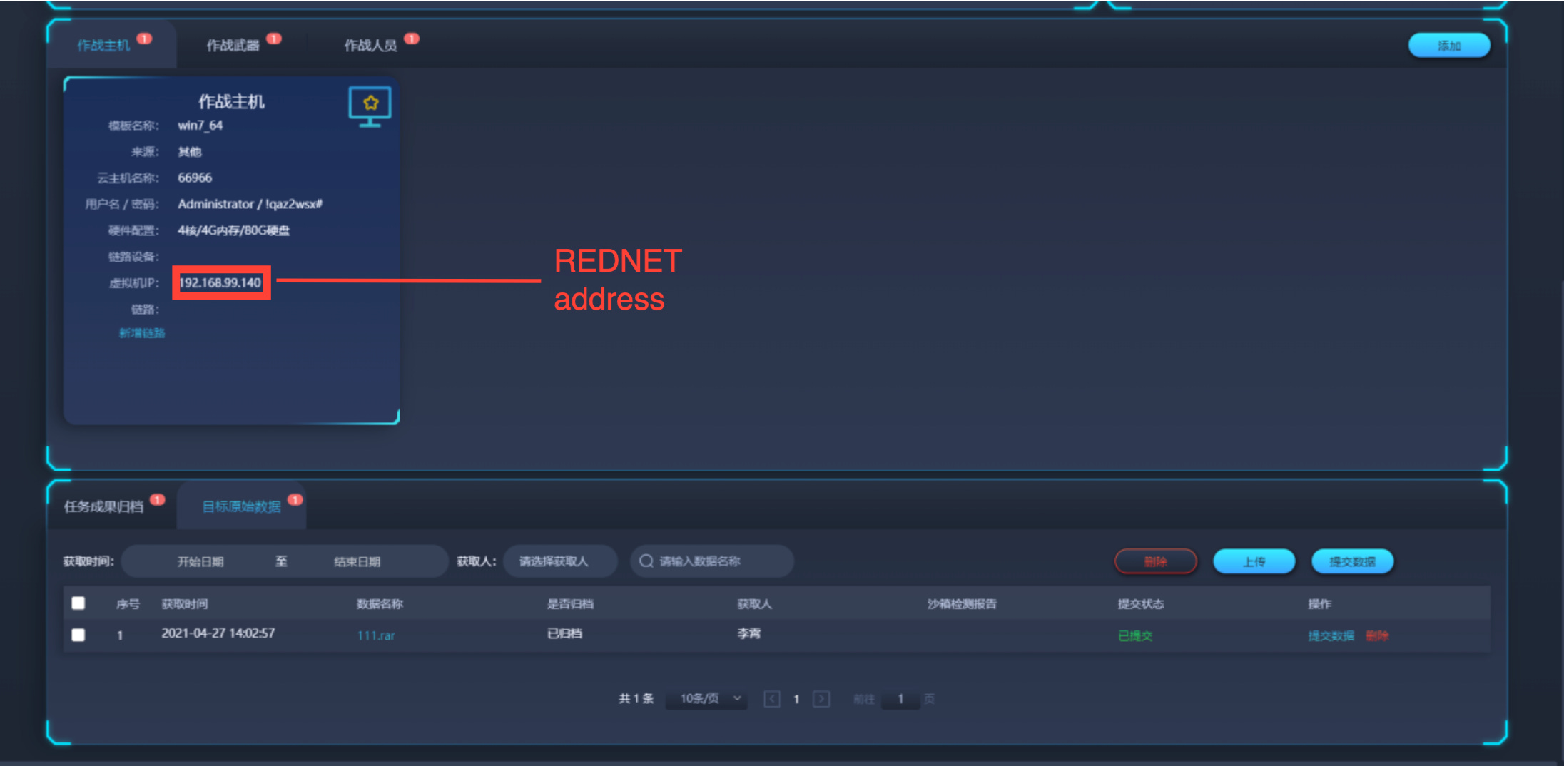 After an operation is completed, the supervisor can instruct the system to download all the raw data from a particular VM. We can also see that there are options to inspect “weapons” and "combatants”, though we don't have more information on how that looks like.
