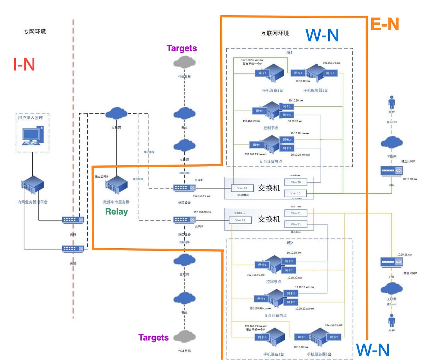 The C-R is consisting of four main elements. One is the Intranet (I-N), the second is the external network (E-N) with its worker nodes (W-N) and the Relay (R) and the "targets”, simulated infrastructure hosts for operatives to run missions against.