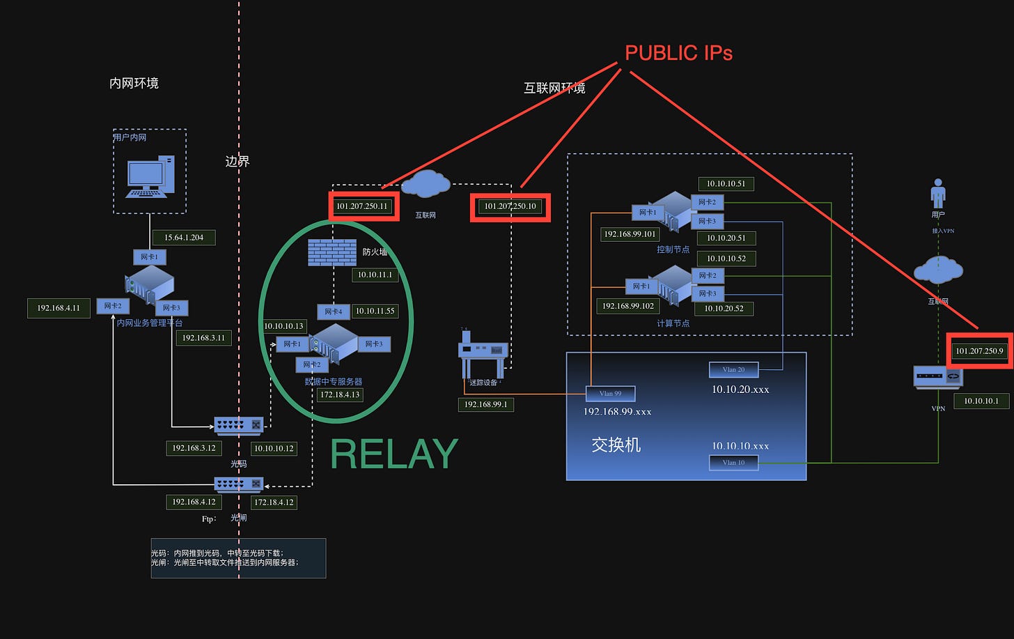 The W-Ns upload and download data via SFTP. While the I-N passes or retrieves data via its “optical gateways” that in turn then use SFTP to convey data to the Relay, each on its separate network configuration. In this function, the Relay also prevents an elements of the I-N to have to face the public internet. Unfortunately not more info is provided in the documents we got acquire.