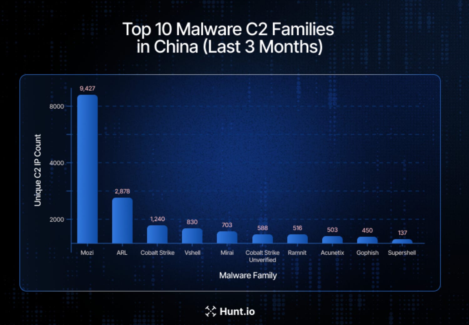Hunt.io identified a small set of prolific frameworks, with MozI leading by a significant margin, followed by Cobalt Strike and VShell—all tools commonly used by Chinese actors. Botnet C2s, particularly Mozi and some Mirai variants, were also prominent. The report notes: “C2 infrastructure dominates malicious activity (~84%), far exceeding phishing infrastructure (~13%), with open directories and public IOCs together contributing less than 4%.”