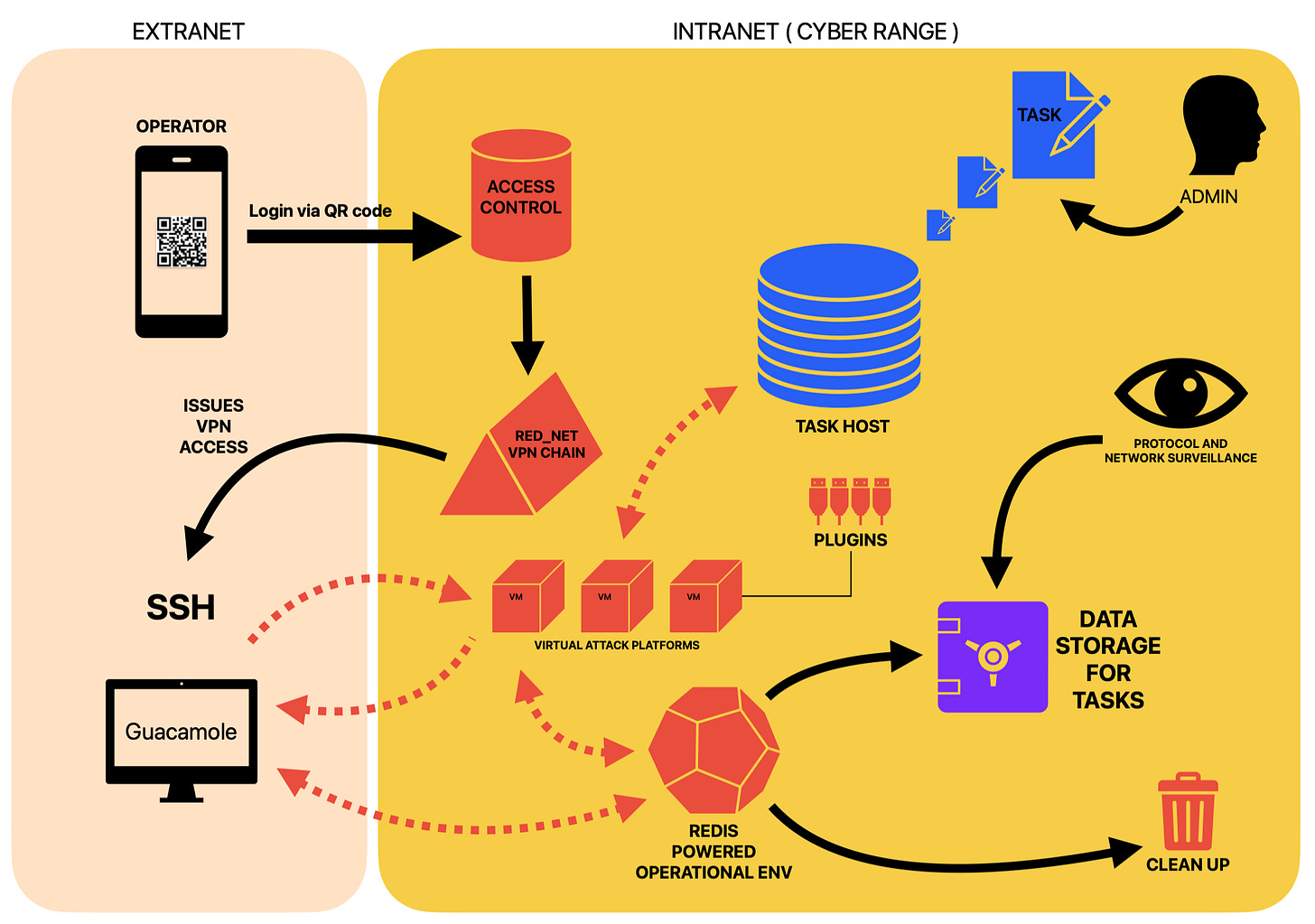 Operator access: All operators seem to gain access to the system from outside via a QR code driven access control. On successful authentication, they are receiving a VPN link to the cyber range environment ( here specified as “red_net”), as they are located outside the cyber range. This VPN service is most likely hardware driven on the side of the cyber range. A Guacamole powered dashboard is the main point of access for the operator, but SSH is possible according to the document.