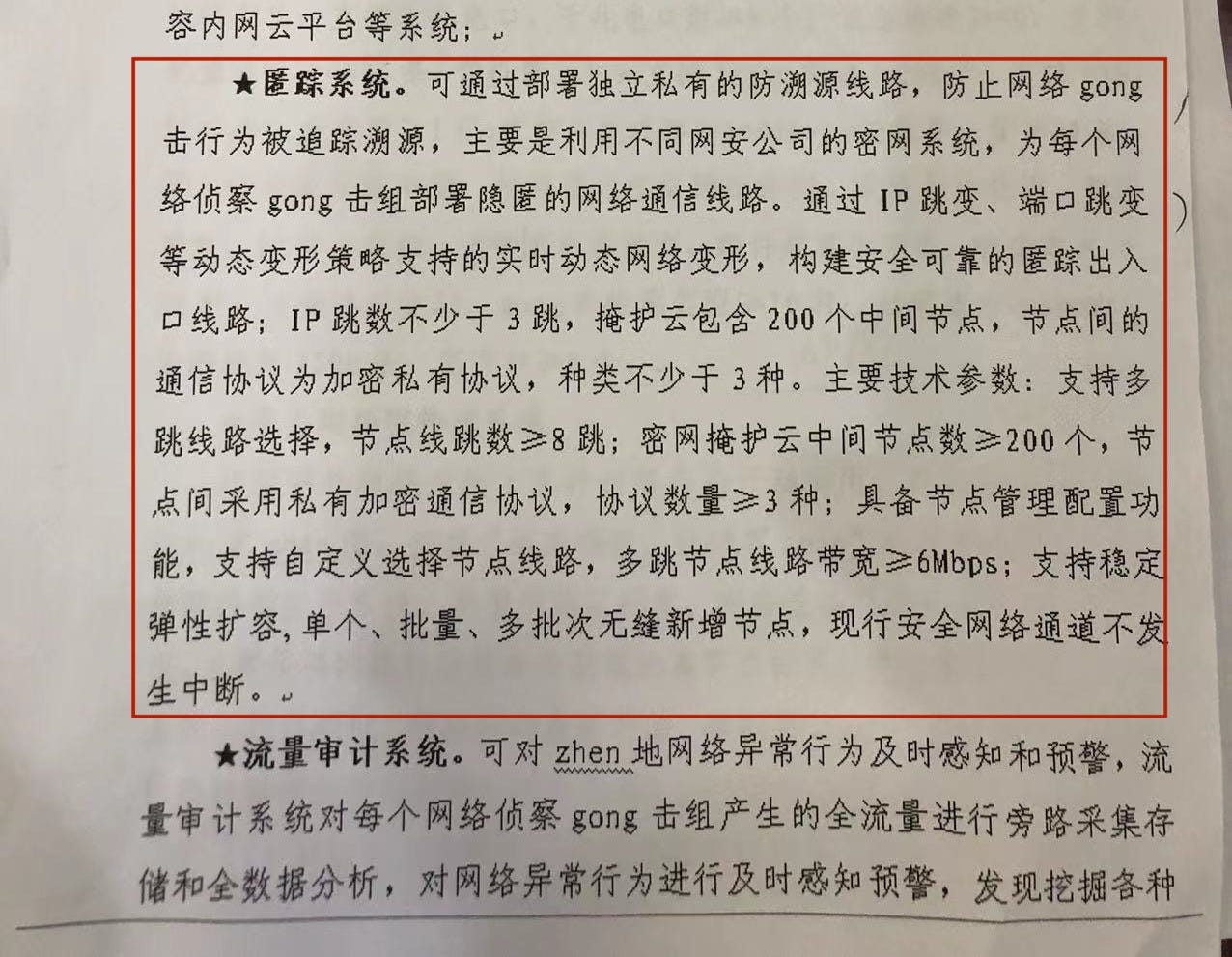 “It can prevent network attacks from being tracked by deploying independent, private anti-piracy routes. Mainly utilizing the dense network systems of different network security companies to deploy hidden network communication lines for each network reconnaissance attack group.”
