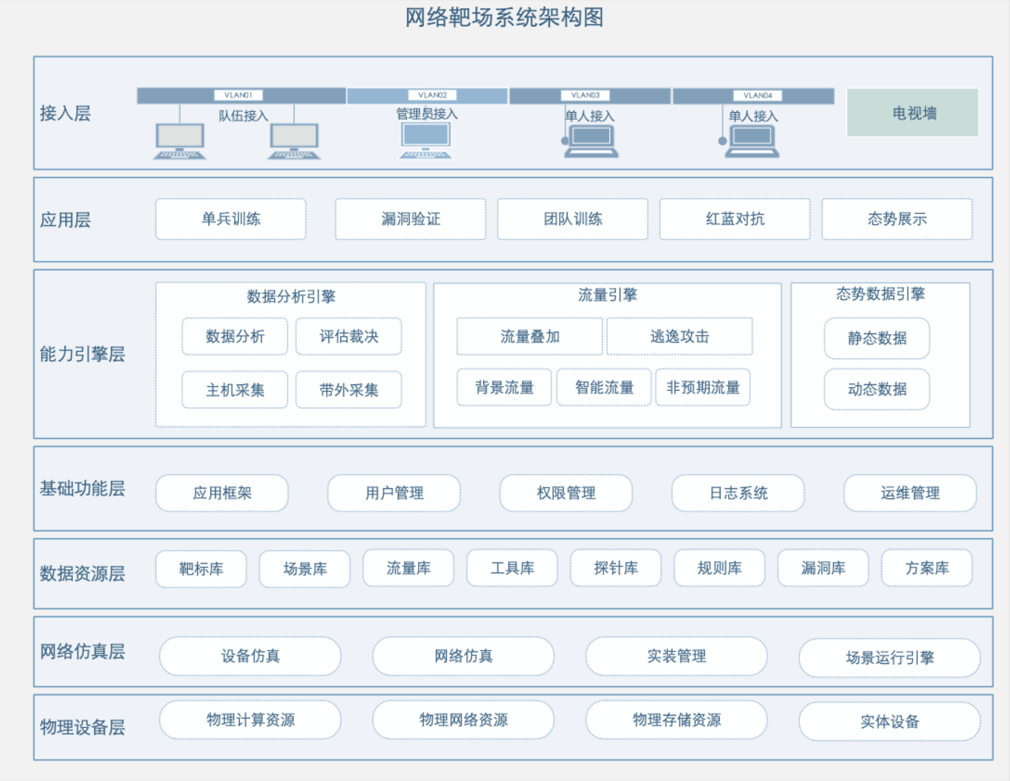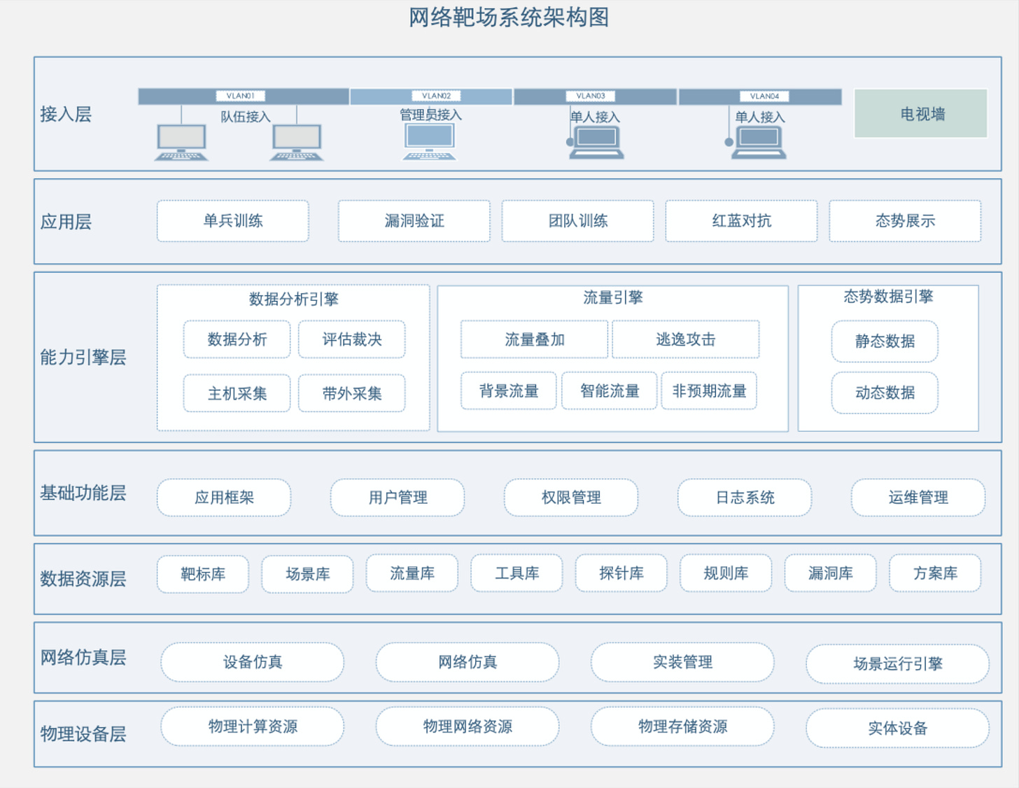 A general layout diagram outlining the system’s functionality and organizational structure reveals a fairly comprehensive cyber-range setup. Under “applications” (second box from the top), it lists: “individual training, team training, vulnerability research”, and “red/blue team confrontations”. It also incorporates extensive libraries for targets, tools, and known vulnerabilities.
