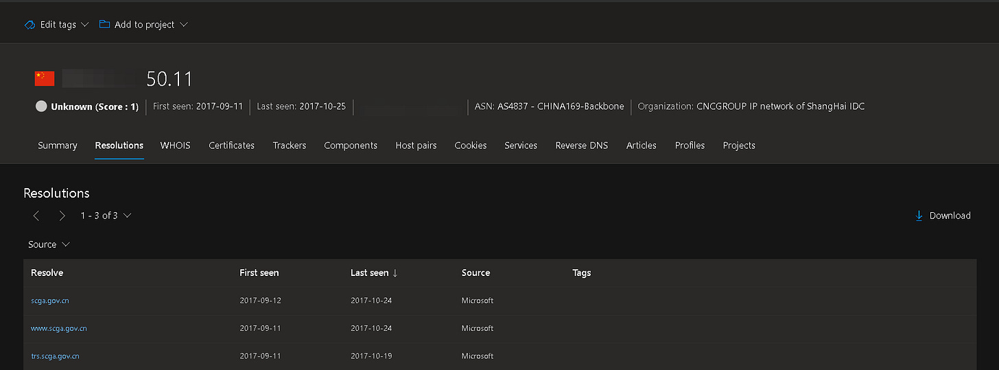 In fig. 2 above are a few public IP's mentioned (we have redacted for now). While testing, we found out that these hosts are still up-and-running in China. A historical IP/domain pairing traces one of the IPs back to a domain once operated by the Sichuan Public Security Bureau (“scga.gov.cn”).